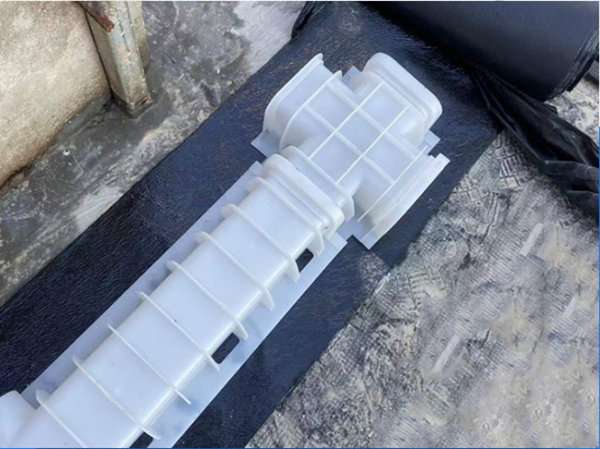 虹吸排水槽功能:將車庫頂板進(jìn)行網(wǎng)格化分區(qū),通過底端兩側(cè)進(jìn)水孔匯集下滲水于排水槽內(nèi),排水槽上方安裝透氣管,使下滲水流入車庫周邊蓄水池內(nèi)。