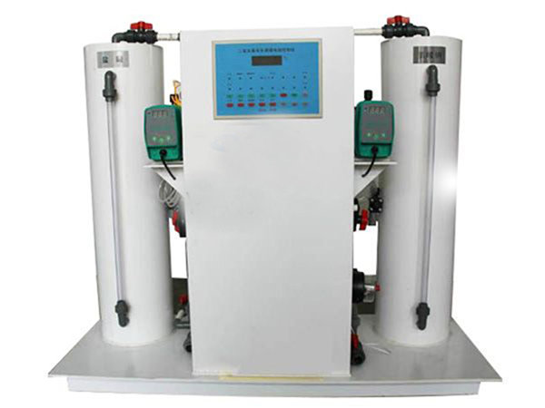 設(shè)備運行的工藝流程一般為:氯酸鈉溶液和鹽酸分別從氯酸鈉儲罐和鹽酸儲罐,經(jīng)過氯酸鈉計量泵和鹽酸計量泵的準確計量進入到主機反應(yīng)釜中,在反應(yīng)釜內(nèi)進行多級反應(yīng),再經(jīng)過射流泵的抽吸后與水混合產(chǎn)生消毒液然后進行投加。